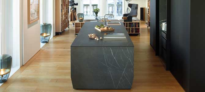 «Los muebles de cocina Santos conforman un bloque homogéneo que resalta, sin estridencias, en una arquitectura sobria y luminosa.» Este es el concepto sobre el que la marca ha diseñado una de sus nuevas cocinas en la que el gres porcelánico Pietra Grey en acabado natural juega un importante papel. La isla de cocina, cubierta con el material que distribuye CUPA STONE, adopta una «forma escultórica que hace olvidar su naturaleza de mueble contenedor», destaca Santos en su web.