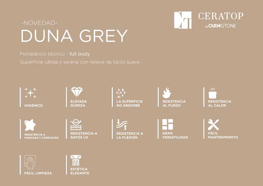 Duna Grey incorpora un avanzado desarrollo tecnológico que permite una continuidad cromática entre la masa y la superficie del material. Esto le confiere una textura con sutil relieve, aportando profundidad visual y una sensación de naturalidad que enriquece el conjunto.