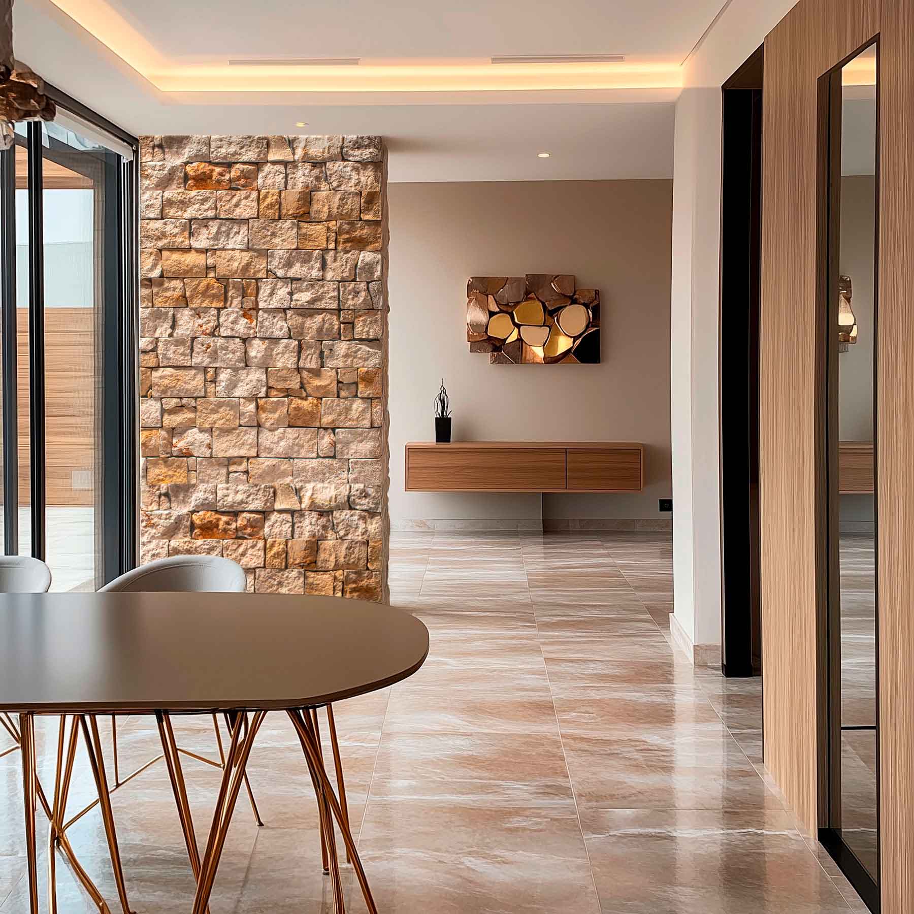 Rusticpanel forma parte de la gama de paneles resinados, combinando una capa de piedra natural con un soporte posterior de resina. Su superficie mantiene un relieve irregular y un aspecto más bruto, lo que lo hace adecuado para proyectos que buscan una estética auténtica y con carácter. Gracias a su formato y composición, facilita la instalación en muros verticales sin renunciar al efecto visual de una piedra colocada de forma manual.
