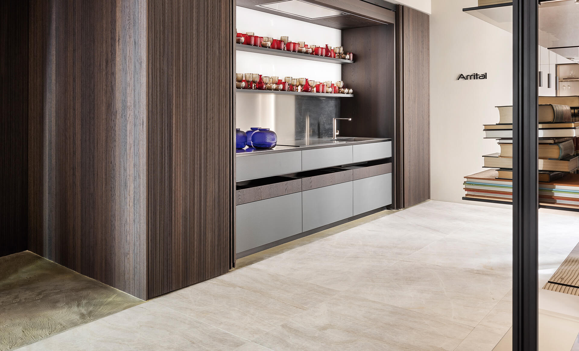 El espacio Arrital busca conseguir una transversalidad temporal entre los diferentes elementos que la componen, con materiales y elementos de diseño de otras épocas que se trasladan a un diseño moderno. Entre estos materiales, destaca la Cuarcita Paraná de Cupa Stone que reviste el suelo y conecta todo el espacio.