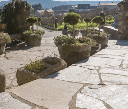 La piedra natural es el material más adecuado para crear suelos rústicos. Resistentes, fáciles de limpiear, antideslizantes y de gran durabilidad y belleza, los pavimentos de piedra natural crean un aire cálido y acogedor para el Palacio de Canedo. Las texturas naturales son las más utilizadas para este tipo de suelos en exterior ya que combinan la belleza con la facilidad de limpieza.