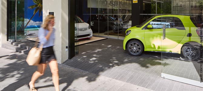 Sofisticado y sugerente, el nuevo Smart Center de Mercedes-Benz Madrid acoge eventos de diversas temáticas de ocio, gastronomía, música y espectáculo. La decoración del showroom juega con el binomio del blanco que domina el espacio y el negro del Basalto Bruno Flameado, sólo roto por los biombos de colores. Su estilo de interiorismo cosmopolita y minimalista responde a un objetivo comercial: llevar propuestas diferenciadores al mercado del motor.