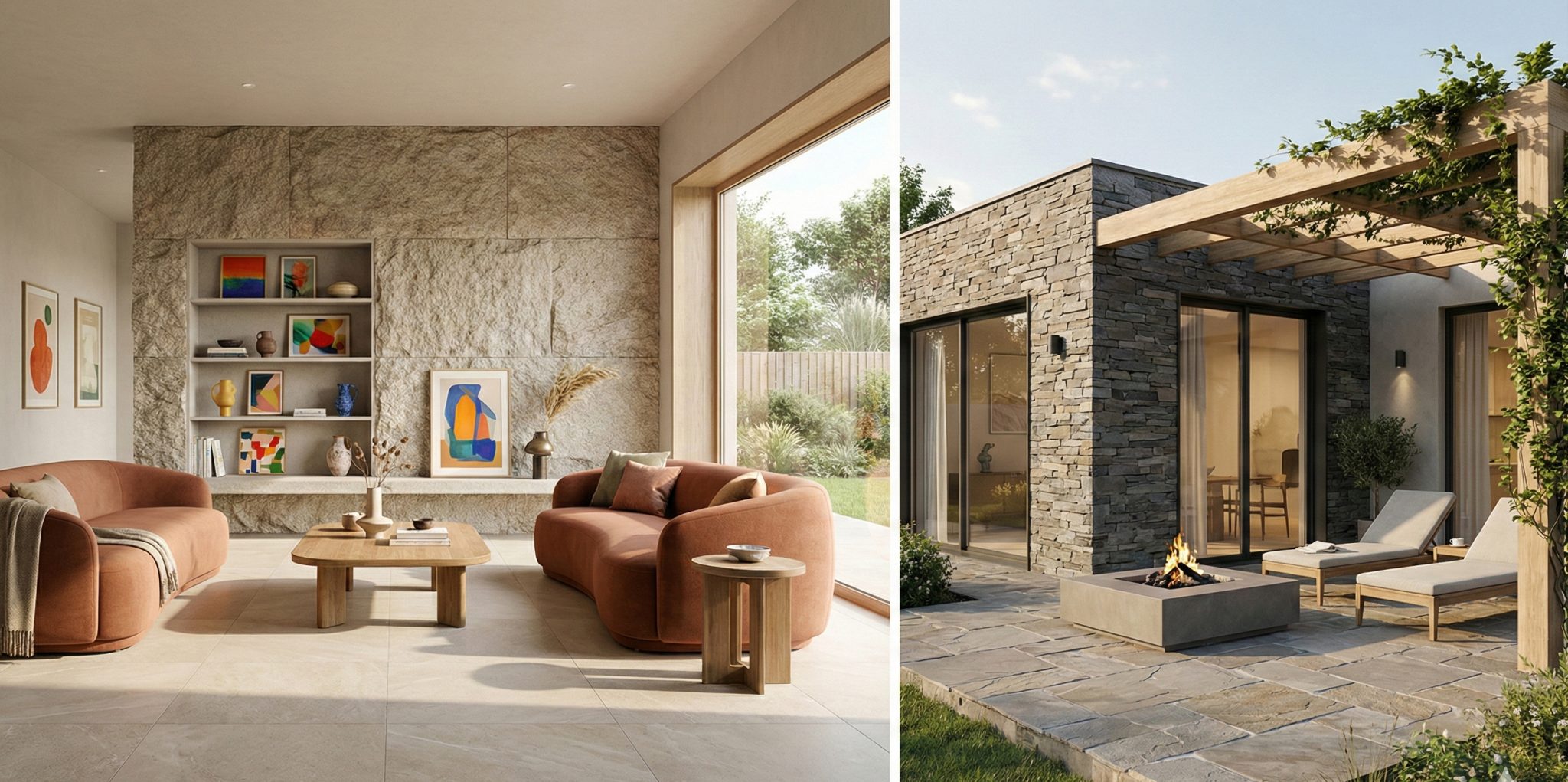 La decoración sensorial gana peso: buscamos materiales que no solo se vean bien, sino que también se sientan bien al tacto. Aquí, la piedra natural y los nuevos porcelánicos avanzados brillan con fuerza.